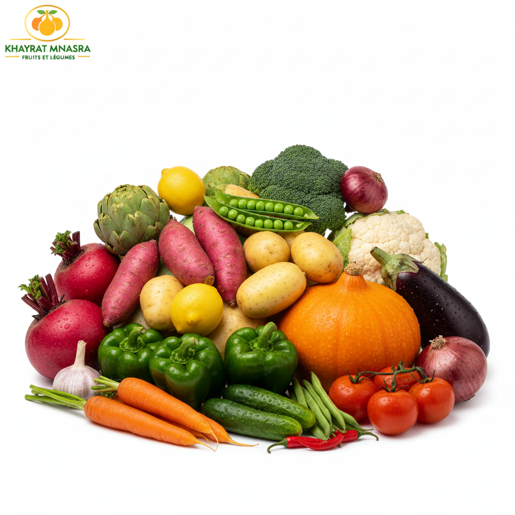 KHAYRAT MNASRA vous propose chaque jour des fruits et légumes frais, livrés directement chez vous par les producteurs locaux. Qualité garantie, prix compétitifs et service rapide. RC:79011